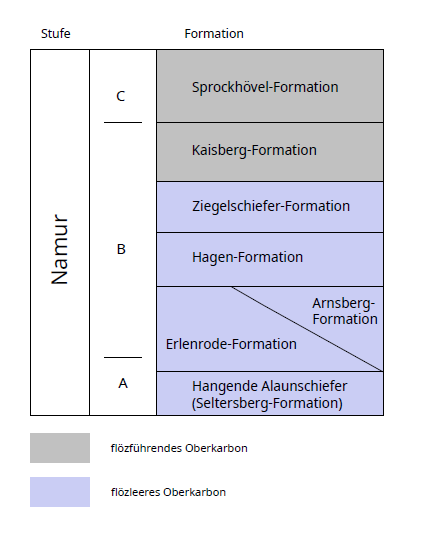 Die Unterkarbon-/Oberkarbon-Grenze findet sich im Ruhrkarbon innerhalb der Hangenden Alaunschiefer (Seltersberg-Formation). Die Karbonatproduktion des Kohlenkalk-Schelfes mit seinen günsten Lebensbedingungen kam damit zum Erliegen. Die Formation besteht vor allem aus dunklen, mit organischem Kohlenstoff angereicherten ungeschieferten Tonsteinen. Häufig tritt Pyrit auf, dessen Verwitterung das als Alaun bezeichnete Kalium-Aluminiumsulfat entstehen ließ. Im verwitterten Zustand sind die Gesteine stark ausgebleicht.