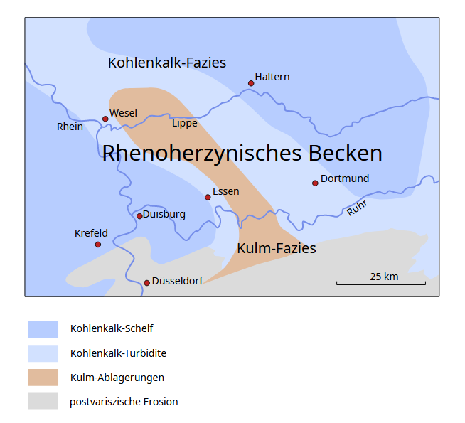 Im Unterkarbon herrschten bei sehr niedrigem Sedimenteintrag zunächst noch eindeutig marine Bedingungen in der Vortiefe. Im Nordwesten kamen flachmarine, fossilreiche Kalksteine zum Absatz. Diese Kohlenkalk-Fazies wurde in Landferne abgelöst durch die Stillwasser-Sedimente der Kulm-Fazies (Abb. 1). In ihr entstanden vor allem dunkle Tonsteine, Alaun- und Kieselschiefer. Von Schwellen innerhalb des Beckens sowie von den Kohlenkalk-Karbonatplattformen gelangten zudem karbonatische Turbidite in tiefere Beckenregionen.
