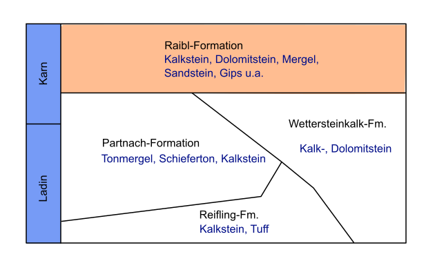 In der Karn-Stufe endeten die für Riffe günstigen Bedingungen, die zur Entstehung der mächtigen Karbonatplattformen der Wetterstein-Formation geführt hatten. Vom nördlich gelegenen Festland erreichten klastische Sedimente den ostalpinen Ablagerungsbereich. Da Korallen auf klares Wasser angewiesen sind, starben die Riffe ab. Die teils klastischen, teils mergeligen, dolomitischen oder Gips-haltigen Ablagerungen werden als Raib-Formation bezeichnet.