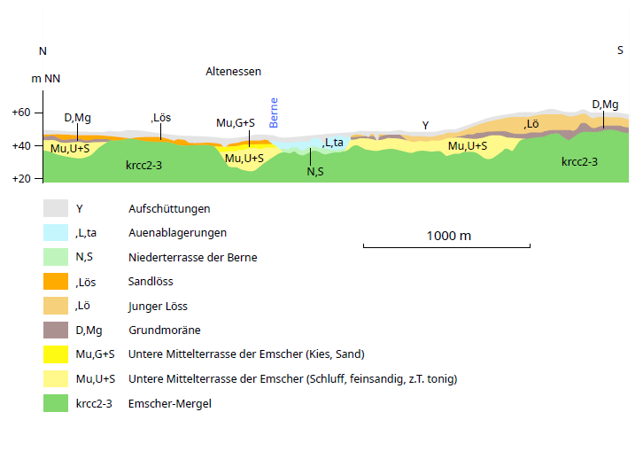Eine besonders mächtiges, rämlich aber begrenztes Vorkommen tritt im Essener Norden auf (Abb. 3). Dort finden sich im Liegenden von äolischen Ablagerungen 15 m überwiegend tonig-schluffige Sedimente fluviatiler Entstehung und darüber 3 m mächtige Sande und Kiese, die wohl einem Nebenfluss oder Seitenarm entstammen und zusammen der Unteren Mittelterrasse der Emscher zugeordnet werden (Pieper 1990) und sich somit auf 18 m Mächtigkeit aufaddieren.