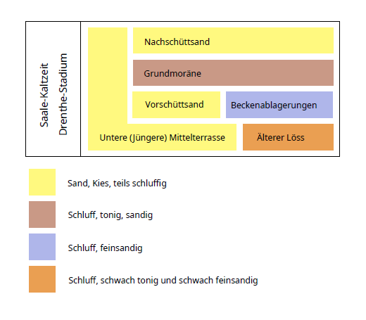 Nur der erste saalezeitliche Eisvorstoß (Drenthe-Stadium) erreichte das Ruhrgebiet. Mit der Ankunft der Gletscher wurde ein Teil der in ihrem Vorfeld befindlichen fluviatilen Sedimente durch Schmelzwässer umgelagert oder ausgeräumt. Im höheren und damit jüngerem Abschnitt des Terrassenkörpers lässt sich daher eine Unterteilung in rein fluviatile und fluvioglaziale Ablagerungen nicht immer sicher durchführen. Eine stark vereinfachte Gliederung der saalezeitlichen Ablagerungen im Ruhrgebiet zeigt Abb. 1. Sedimente aus der Zeit des zweiten Eisvorstoßes (Warthe-Stadium) sind aus dem Ruhrgebiet nicht bekannt.