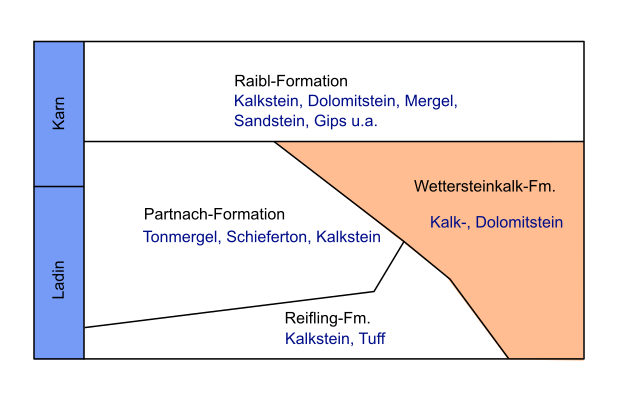 Die Wetterstein-Formation umfasst Gesteine, die sich in der Ladin- und Karn-Stufe der Alpinen Trias bildeten (Abb. 1) und in den Nördlichen Kalkalpen weite Verbreitung finden. Sie treten dort auf im Bayerisch-Nordtiroler und im Berchtesgadener Faziesraum. Ihren Namen hat die Formation nach dem deutsch-österreichischen Wettersteingebirge. Die Sedimente entstanden zeitgleich mit den Ablagerungen der Partnach-Formation. Während letztere als Absatz in Becken mit schlechter Wasserzirkulation angesehen werden können, gab es daneben flachere Stellen, die noch vom Licht durchflutet waren, und die günstige Bedingungen für die Besiedlung durch Riff-bildende Organismen wie Korallen und Kalkschwämme boten.