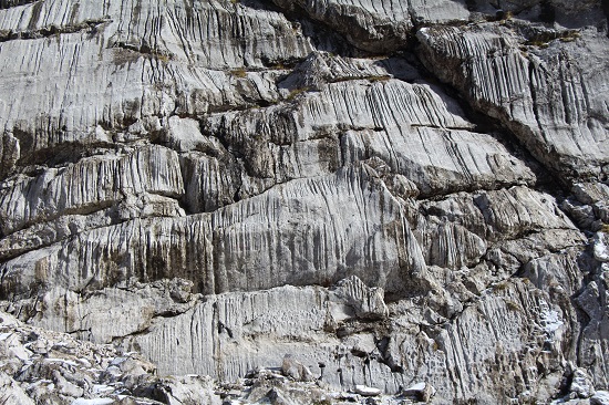Anders als der etwas jüngere Hauptdolomit ist der Wettersteinkalk verkarstungsfähig (Abb. 4). In seinem Ausstrichbereich treten daher Lösungsformen wie Karre, Dolinen und Höhlen auf. Die von ihm aufgebauten Berge zeichnen sich oft durch steile, glatte Wände aus.