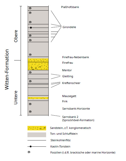 Die Witten-Formation umfasst den unteren Abschnitt des Westfal A. Sie beginnt an der Basis des marinen Sarnsbank-Horizontes, der im Hangenden von Flöz Sarnsbank 2 folgt, und reicht bis zur Obergrenze von Flöz Plaßhofsbank bzw. zur Basis des marinen Plaßhofsbank-Horizontes. Gegliedert wird die Witten-Formation in die Untere- und die Obere Witten-Formation (Abb. 2).