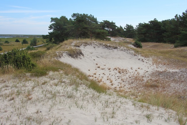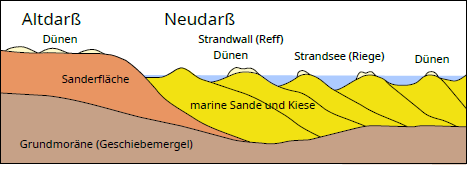 Nördlich des fossilen Meereskliffs folgt der Neudarß. Dort entstehen seit 4000 Jahren parallel verlaufenden, langgestreckte Strandwällen, denen Dünen aufsitzen (Abb. 4) und die als Reffe bezeichnet werden und heute fast durchweg bewaldet sind. Durch diesen Entstehungsprozess nimmt das Alter der Reffen von Süden nach Norden ab. Die dazwischenliegenden, teilweise vermoorten Täler werden als Riegen bezeichnet. Dies sind ehemalige Strandseen, die mittlerweile verlandet sind. An der Nordspitze des Darß (Darßer Ort) findet aktuell durch Sandablagerung eine Hakenbildung statt. Abb. 5 zeigt eine noch nicht vollständig durch Vegetation fixierte Düne nördlich des Leuchtturms im jüngsten Teil des Darßes.