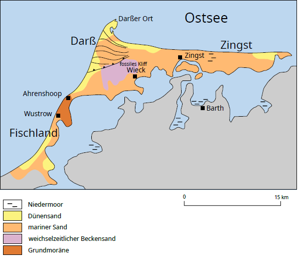 Bis zum Ende des weichselzeitlichen Spätglazials war das Gebiet der heutigen Halbinsel Fischland-Darß-Zingst von Gletschern bedeckt, denen Sanderflächen vorgelagert waren. Die Ostsee existierte noch nicht. Als Ablagerungen entstanden Geschiebenmergel und Schmelzwassersedimente. Als vor rund 7000 Jahren im Rahmen der Litorina-Transgression das Meer vorstieß, wurden große Bereiche der Region überflutet und Bestandteil der Ostsee. Als Inselkerne ragten Fischland, der Altdarß, West- und Ost-Zingst aus dem Meer.