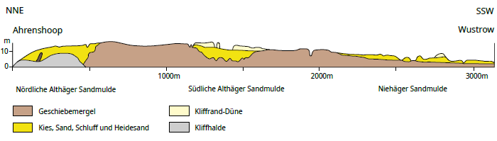 So wird an einigen Stelle der Geschiebemergel durch Senken ersetzt, die mit fossilhaltigen Mudden und Sand gefüllt sind und ehemalige Toteisbecken darstellen. Über den austauenden Toteisblöcken hatten sich im Spätglazial dort Seen gebildet, in denen Mudden zur Ablage kamen und die anschließend mit äolisch oder fluviatil antransportiertem Feinsand überdeckt wurden und verlandeten. Das Ausschmelzen des Eises im Untergrund und die Auffüllungen passierten gleichzeitig. An den organischen Muddenkomponenten durchgeführte Altersbestimmungen ergaben, dass diese in der Älteren Dryaszeit oder dem Alleröd-Interstadial entstanden.
