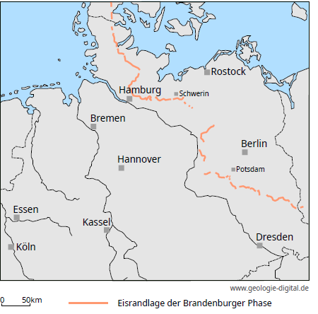 Der Eisrand verlief durch das östliche Schleswig-Holstein, nordöstlich an Hamburg und südlich an Schwerin vorbei. Dann bog er stärker nach Südosten und schließlich nach Süden um, bis er etwa bei der Stadt Brandenburg wieder nach Südosten umschwenkte und über Luckenwalde und nördlich von Cottbus vorbei zur polnischen Grenze verlief. Abb. 2 zeigt den bekannten Verlauf des als Brandenburger Phase bezeichneten Eisvorstoßes.