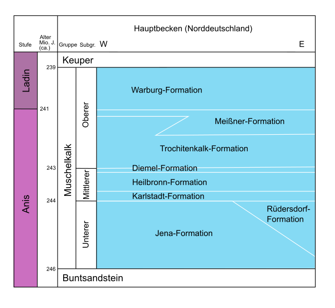 Der Muschelkalk ist die mittlere lithostratigraphische Gruppe der Germanischen Trias. Unterlagert wird die Gruppe von der Röt-Formation des Buntsandsteins. Die Hangend-Grenze wird durch die Erfurt-Formation des Keupers gebildet.