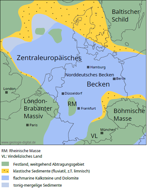 Zur Entstehungszeit des Muschelkalks nahm das Zentraleuropäische Becken (Abb. 1) einen Großteil Mitteleuropas ein. Das Becken wurde ausgefüllt durch ein flaches Randmeer der Neotethys. Mit dem offen Meer weiter südlich stand es über verschiedene, als Pforten bezeichnete Verbindungswege in Kontakt. Der Meeresvorstoß zur Zeit des Unteren Muschelkalks kam überwiegend aus Südosten durch die Oberschlesische Pforte, während er im Oberen Muschelkalk aus südwestlicher Richtung durch die Burgundische Pforte stattfand.