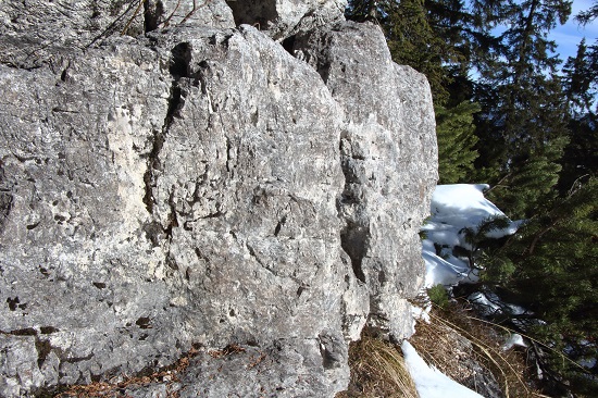 Die erkennbare Bankung der Dachsteinkalke geht zurück auf dünne Lagen aus feingeschichten Dolomiten. In rhythmischer Weise fiel der damalige Lagunenboden trocken. Die Sedimentation, die zur Bildung der dickbankigen Kalksteine führte, wurde dann unterbrochen. Das freiliegende Sediment verwitterte und wurde durch Wellenschlag aufgearbeitet, was sich im Sediment teilweise durch eingelagerte Brekzien niederschlägt. Bei sehr niedriger Wasserbedeckung kam es zur Besiedlung mit Algen, die heute als feingeschichtete Laminite vorliegen.