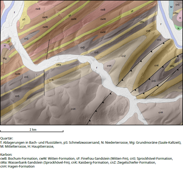 Der hier betrachtete Kartenausschnitt in Abb. 1 liegt im Bereich des Stockumer Hauptsattels und zeigt das Höhenmodell für einen Geländeausschnitt südlich und östlich von Essen-Kupferdreh. Die Höhendifferenzen zwischen den Tälern und den Bergrücken in dem Gebiet betragen maximal rund 180 m. Der Ausstrich der Falten lässt sich sowohl anhand der Berg-und-Tal-Verläufe in Abb. 1 als auch in der geologischen Karte in Abb. 2 gut verfolgen. Die Faltenachsen, also die gedachten Linien der stärksten Krümmung, liegen nicht horizontal im Raum. Sie zeigen vielmehr ein wellenartiges Auf- und Absinken. Dies wird als Achsenwellung bezeichnet und führt an der Oberfläche zu umlaufendem Streichen. Dies ist in Abb. 2 gut erkennbar.